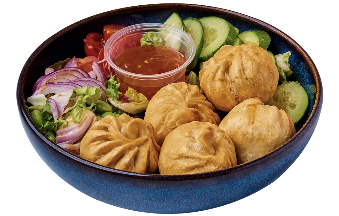 Inbakt kjottdeig med ost, serveres med salat og Sweet chili dressing.