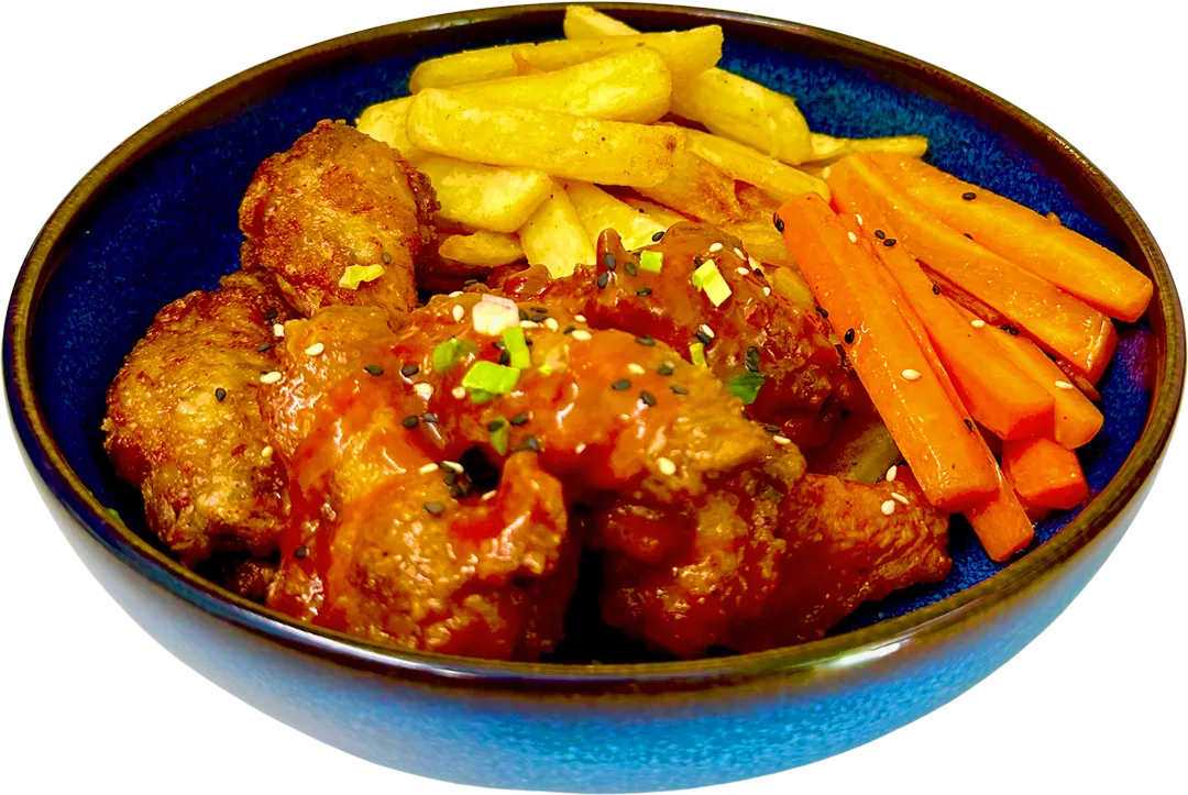 Friterte kyllingvinger og klubber med to ulike smake Serveres med pommes frites, glaserte gulrotter og husets chili saus. Toppet med varlok og sesamfro.