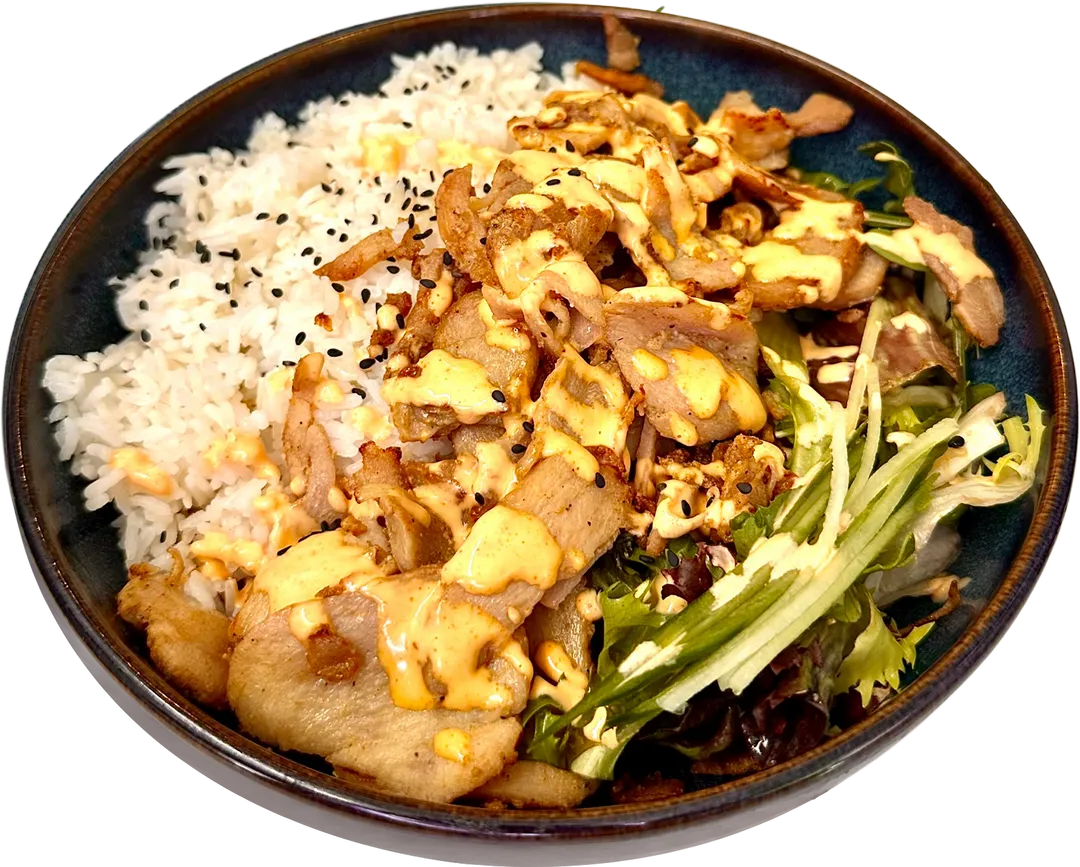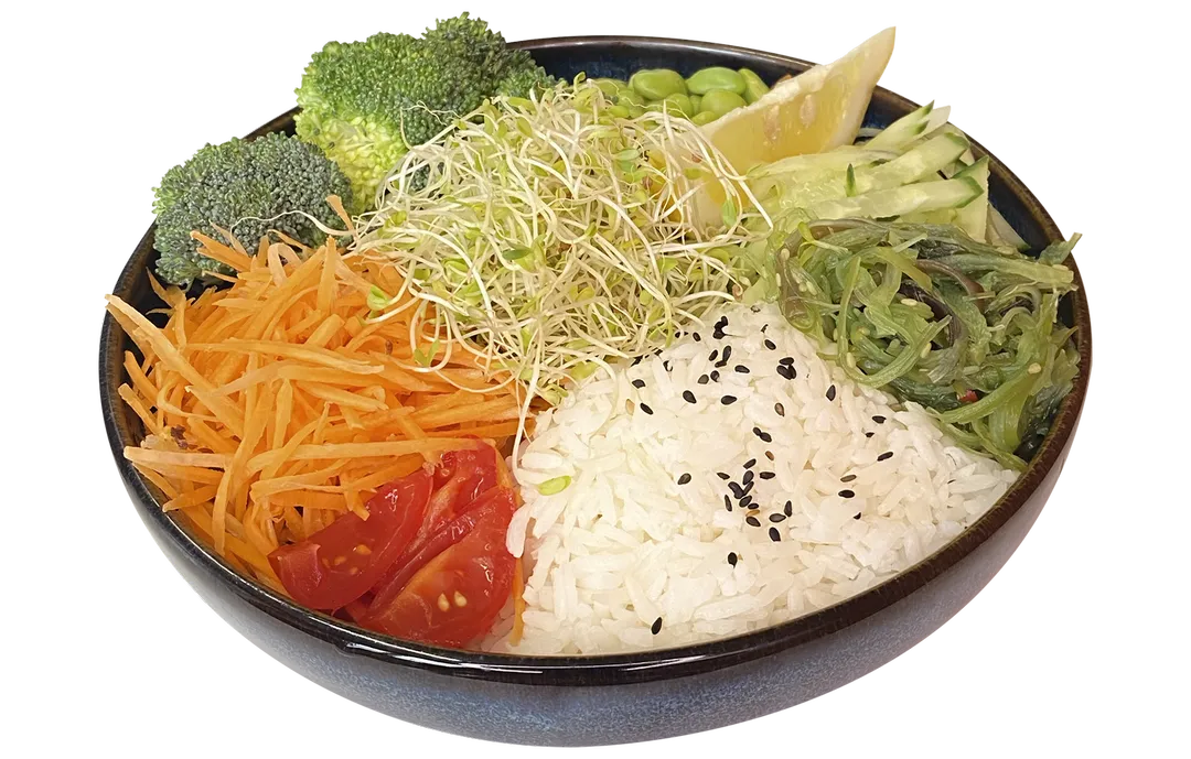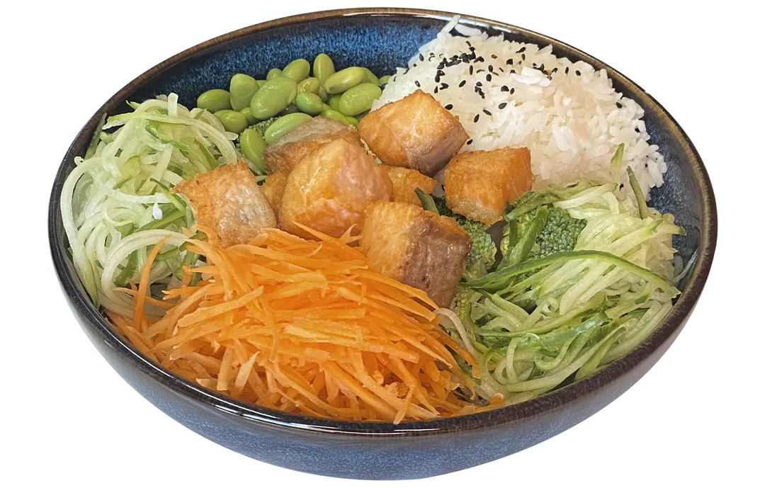 Salat Bowl med fritert laksebiter/kyling/skampi/Tofu, avokado, soyabonner, salat, agurk, gulrot, brokkoli, sjogress salat, og sesamfro. Serveres med husets salatdressing og ris.