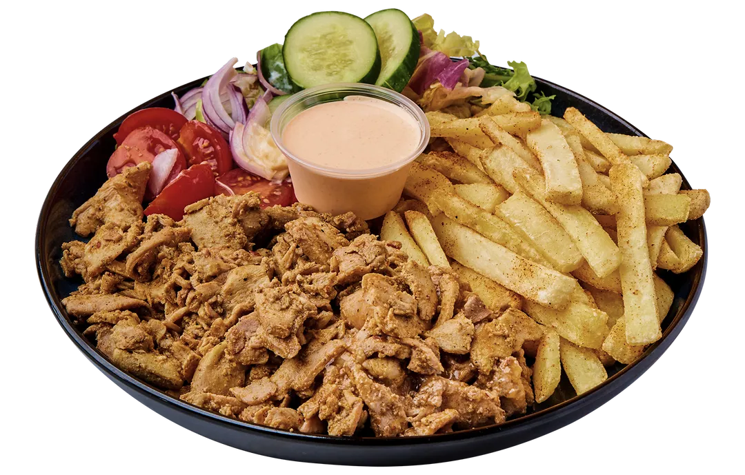 Kylling, pommes frites, dressing, salat og spicy shawarma brod.