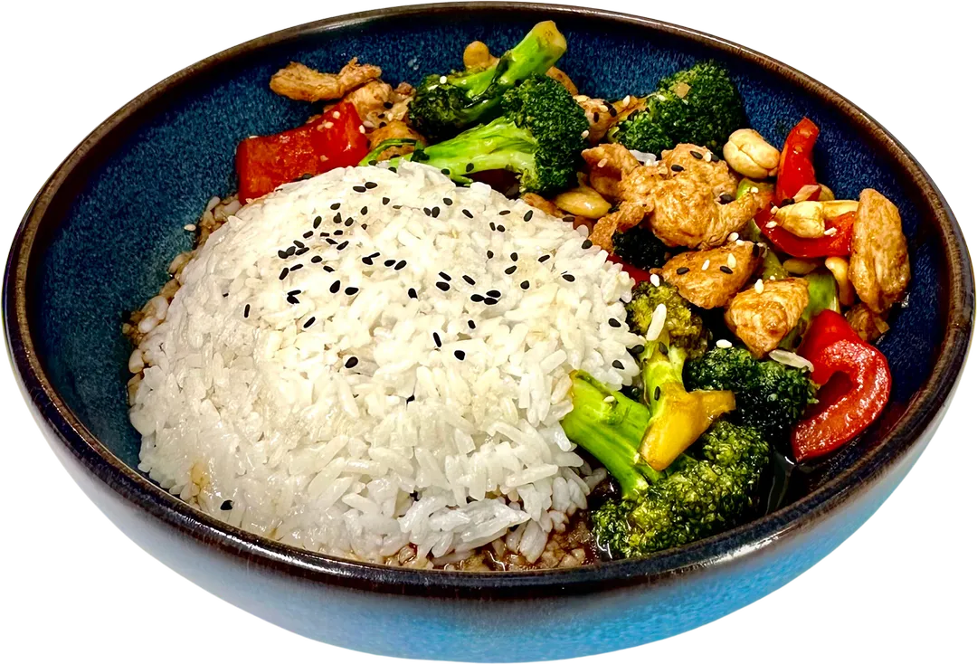 Marinert kylling, paprika, varlok, brokkoli, cashewnotter med husets wok saus og sesamfro, Serveres med ris.