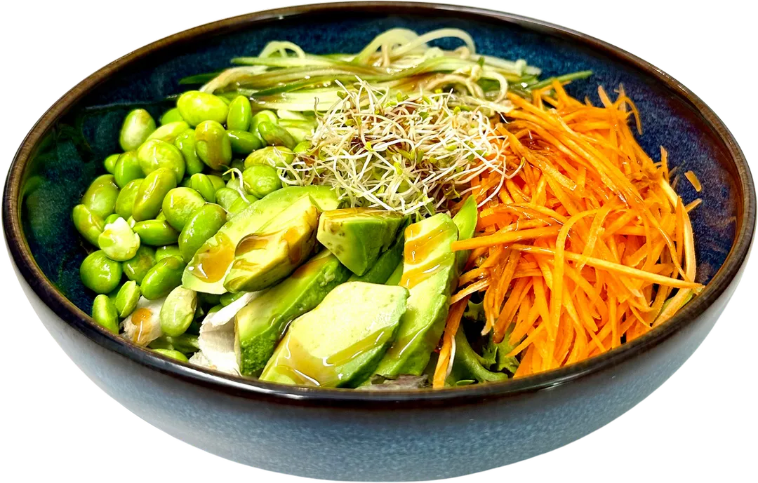 Salat Bowl med avokado, soyabonner, salat, agurk, gulrot, brokkoli, sjogress salat, bonnespirer og sesamfro. Serveres med husets salatdressing.