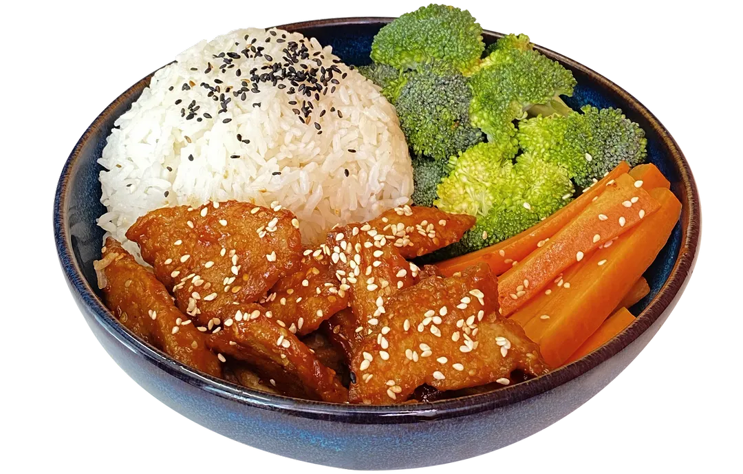 Kyllingfilet woket i hjemmelaget sursotsaus toppet med soyaglasert brokkoli og gulrot. Servere med ris.