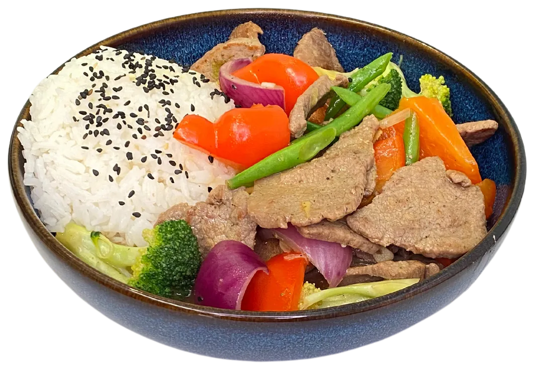 Stekt yttrefillet med brokkoli, paprika, aspargesbonner, varlok, rodlok med hjemme laget chili saus. Serveres med ris.