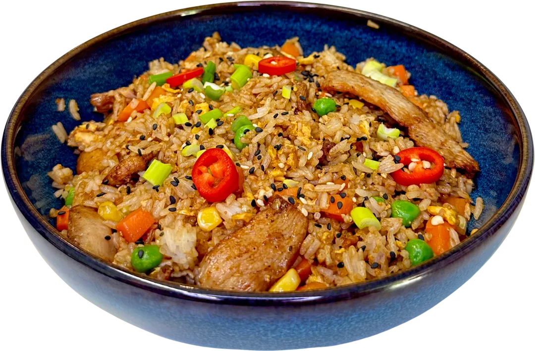 Stekt ris med gulrot, mais, erter og egg serveres med kylling/laks(fisk)