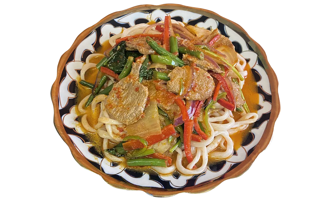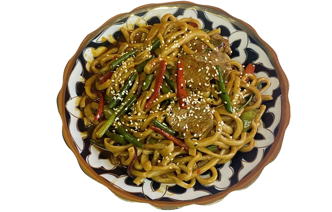 Ytrefillet, lok, paprika, aspargesbonner, napakal og handlaget nudler.